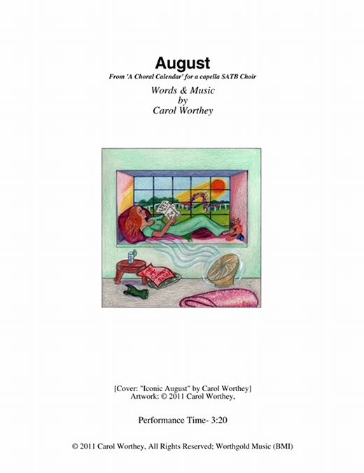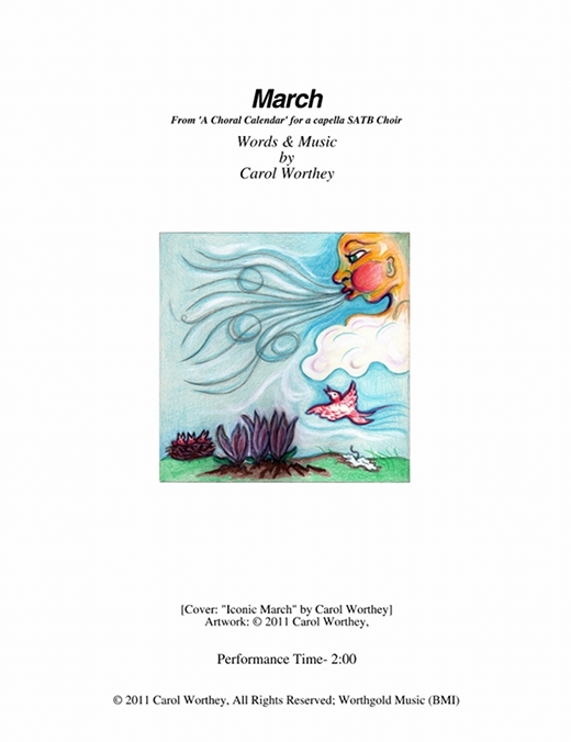 Composer/Painter/Writer Carol Worthey is proud to announce the "birth" of a new major work for choir: Twelve musical portraits of each month painted in musical colors and textures that depict the characteristic moods, changing weather, special holidays and unique feeling of each month. "A Choral Calendar" is a uniquely flexible work in its performance possibilities: It is designed to function enjoyable as a whole concert piece, with each stylistically distinct month flowing one to the next until an entire year is portrayed in music, in artwork and in verse. It is also a multi-faceted set of pieces, each unique, that can function with each month being performed by itself as the year passes, or for special occasions such as a Holiday, a Wedding or to celebrate a Birthday during any particular month.